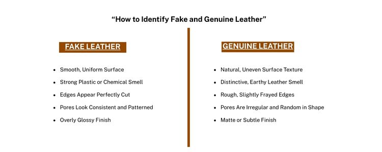 Real leather has a specific soil-like smell and is soft but firm. Fake leather looks very smooth and smells like plastic or chemicals.
